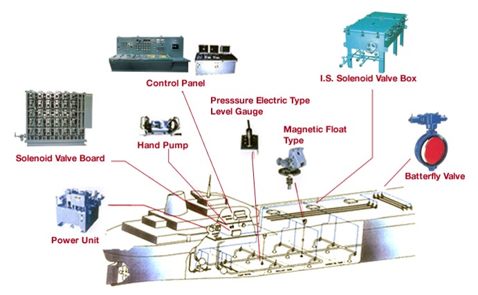 Cargo, Ballast, Service tank level gauging equipment, Draft Gauge, Pressure & Temp. Indication system, Cargo and Ballast VRCS, ODM (Oil Discharge Monitoring and Control System),Bilge Separators (Oil-water separator)